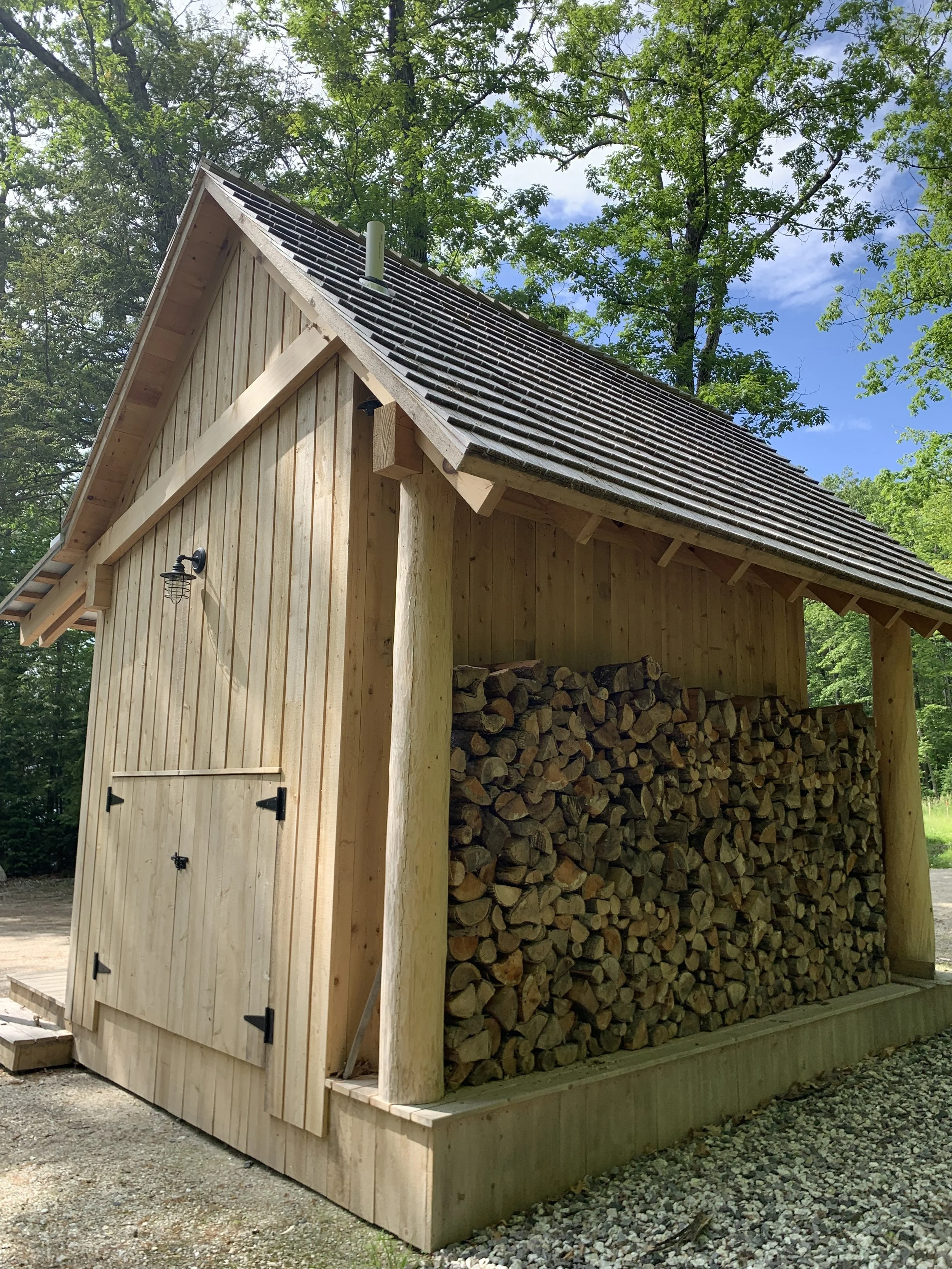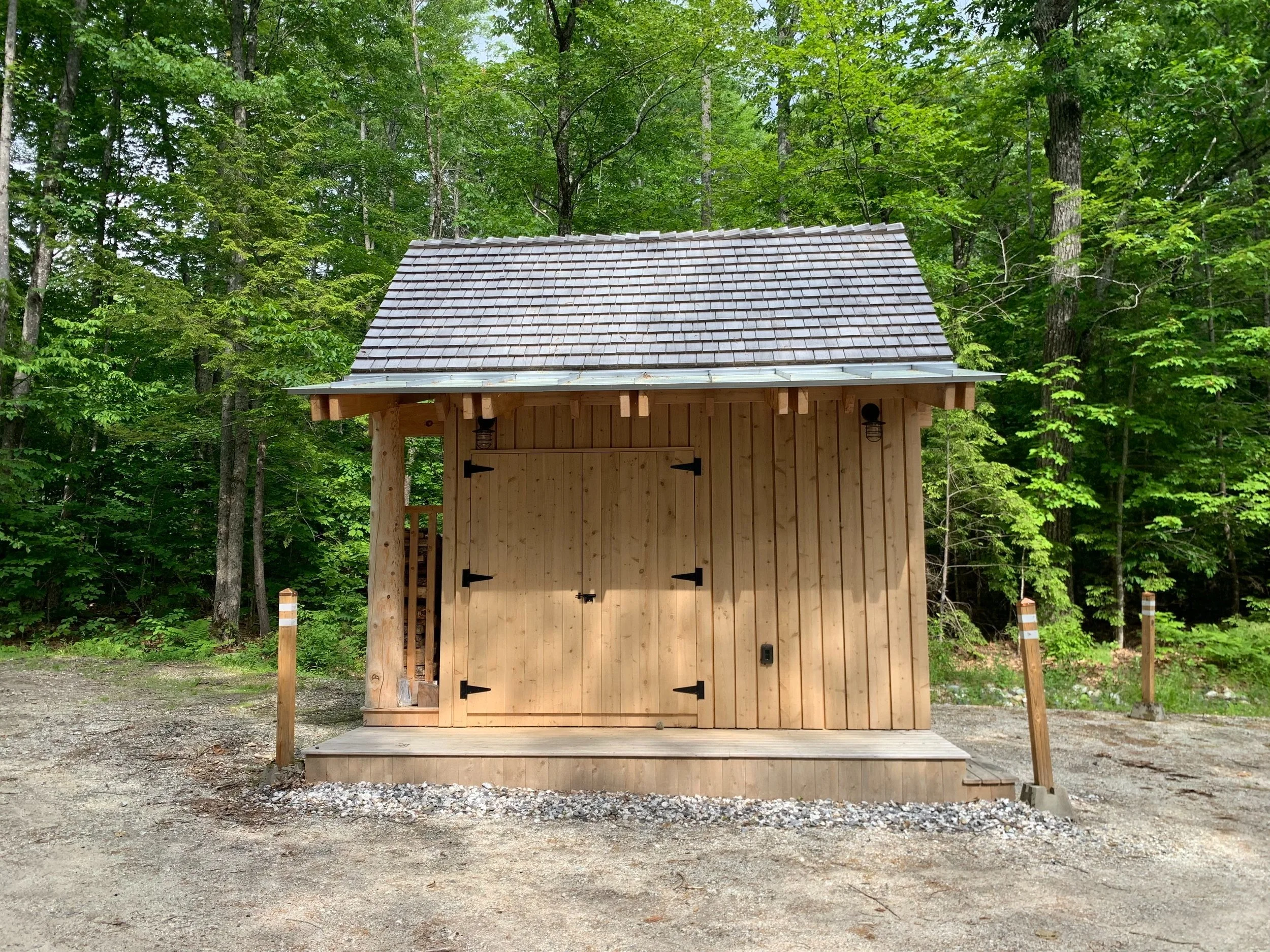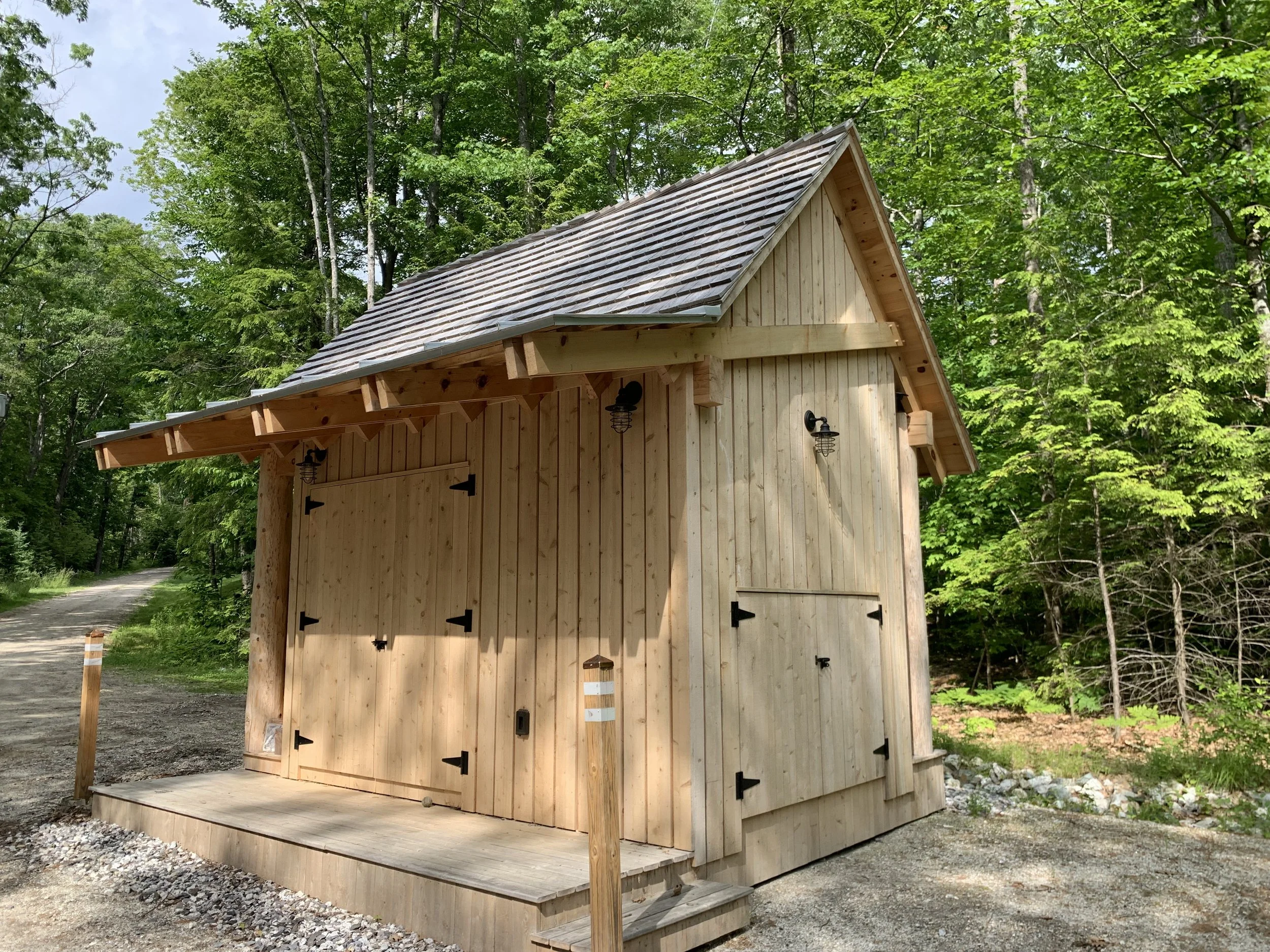 Finish framed wood shed. White cedar posts, siding, and shakes.